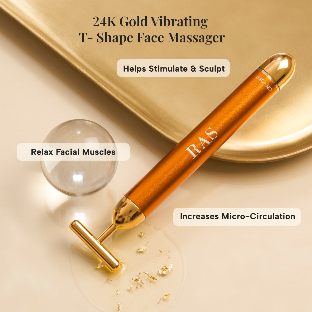 Introducing the luxurious 24k Gold Massager Trio Set - an indulgent experience for your skin with 24K Gold Elixir, T-Shape Massager and Petal Shape Vibrating Massager. Achieve radiant, glowing skin just in time for the celebrations, making you the highlight of every festivity.