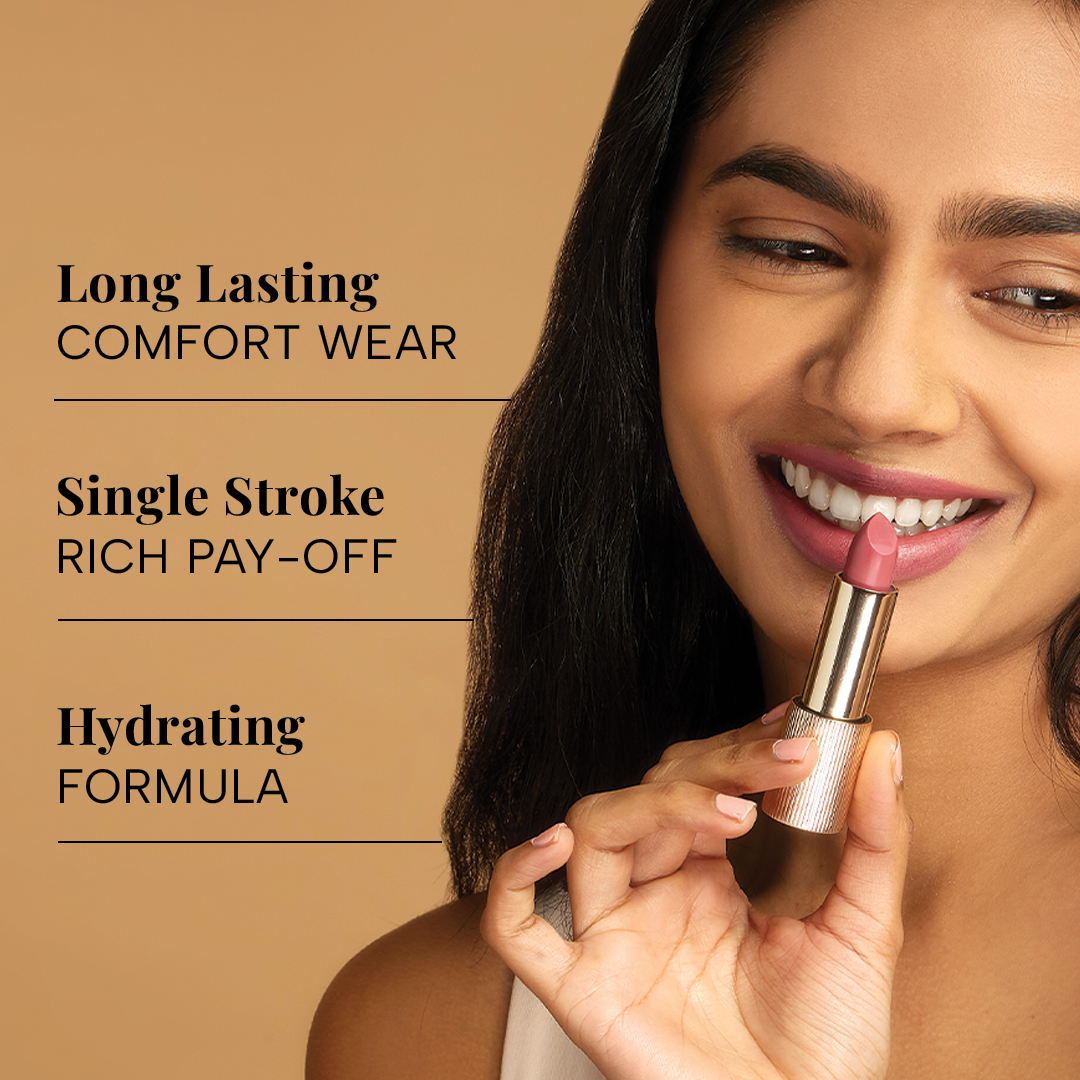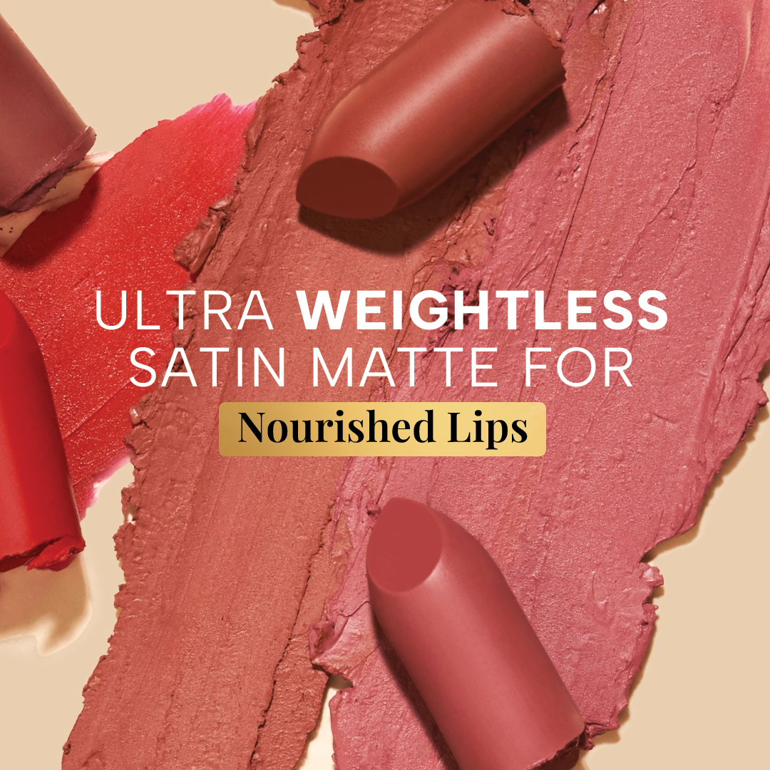 Quantity: 4.2gm Experience the luxurious Lumiere Satin Matte Lipstick, a revolutionary formula that combines intense color payoff with the nourishing benefits of a lip treatment. This innovative lipstick glides seamlessly onto the lips, delivering a vibrant, full-coverage look in a single stroke. The unique formulation is enriched with a blend of Avocado, Argan, and Rosehip oils, ensuring your lips remain hydrated, smooth, and supple throughout the day. Its advanced blurring technology creates a soft-focus, velvety matte finish that feels weightless and comfortable, without any cracking or dryness. Designed to complement all Indian skin tones, Lumiere offers a curated selection of shades to enhance your natural beauty and provide long-lasting, non-transferable color that stays flawless from morning till night.