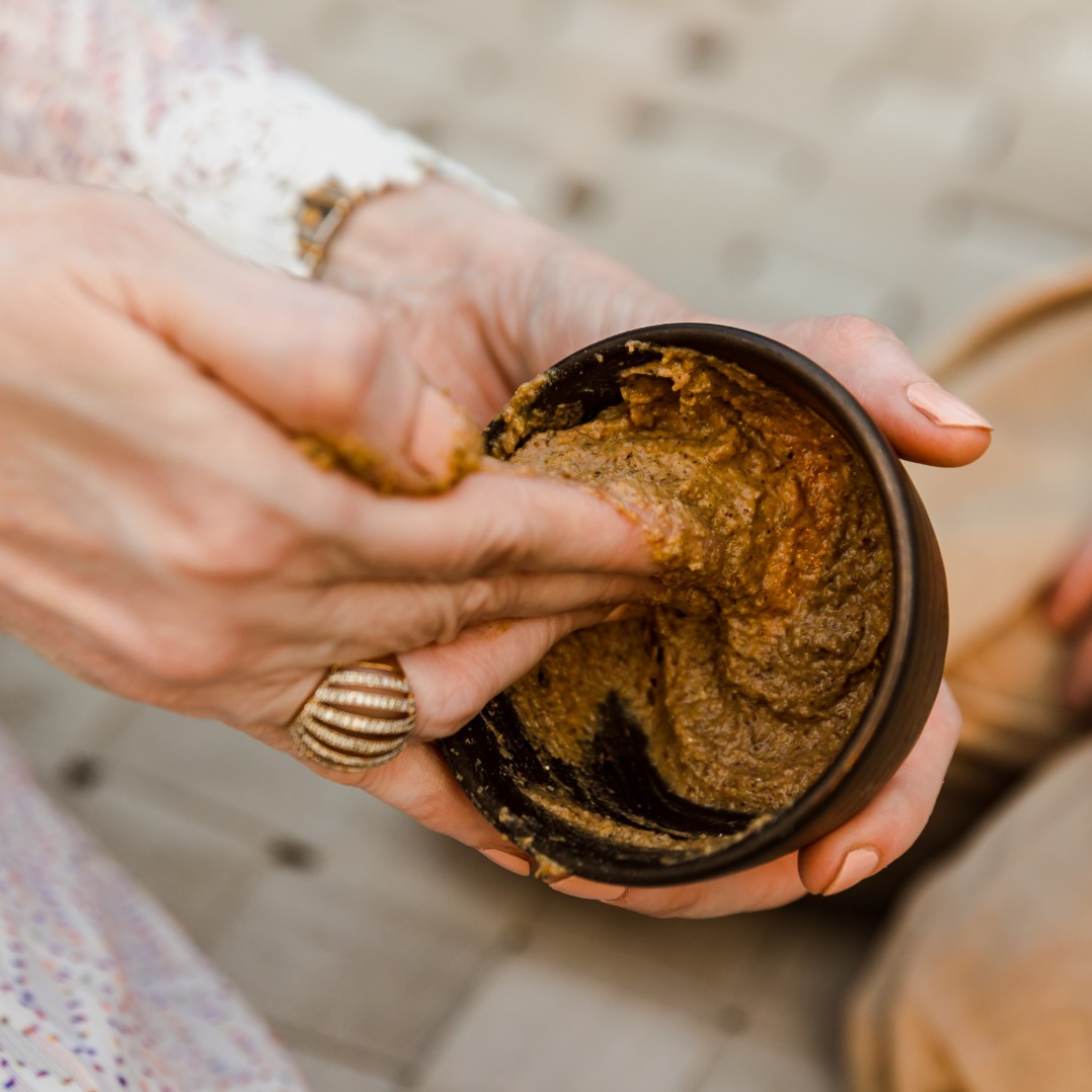 Scoop out the ubtan and mix with water apply on face neck, arms or body.