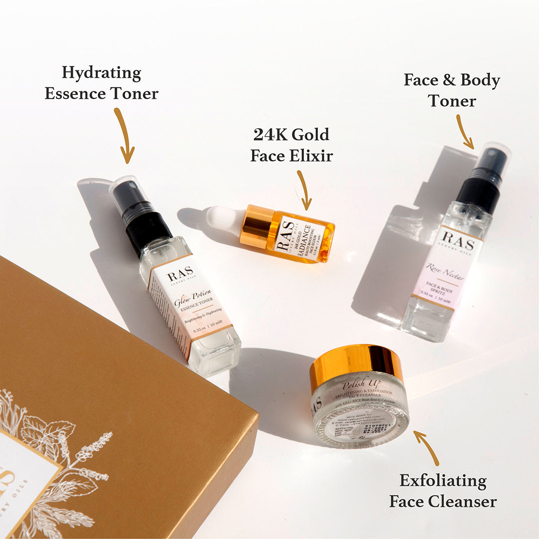 • Take 2-4 pumps of Glow Potion into clean hands and pat the toning essence onto the face and neck. Use twice daily after cleansing followed by the RAS Face Gel Serum/ Face Elixir