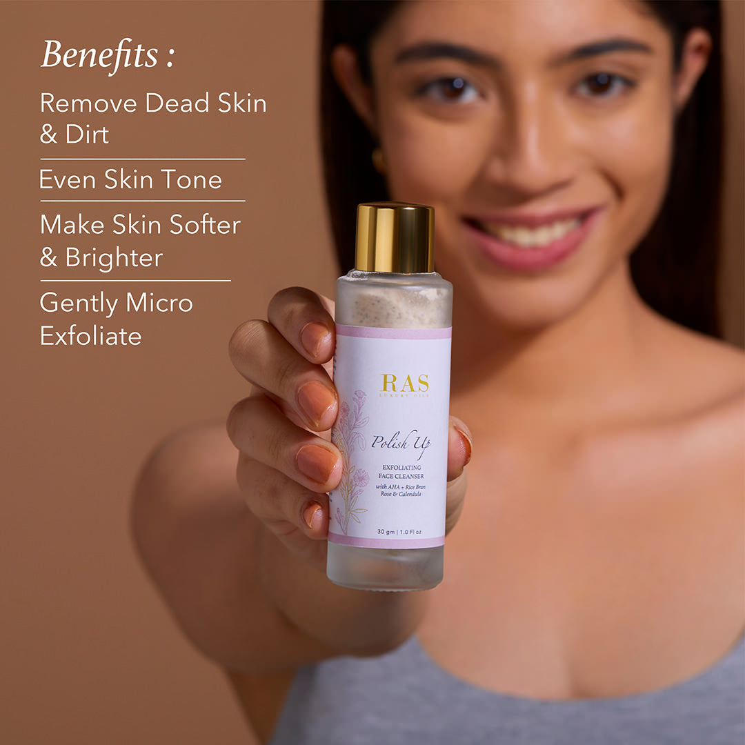 • Take a coin-sized amount of Polish Up into your palm & add enough water to form a paste. Rub your hands together to create a mild foam, massage gently in circular motions over wet skin, avoiding the eye area, for 30-45 seconds. Rinse it off with lukewarm water.