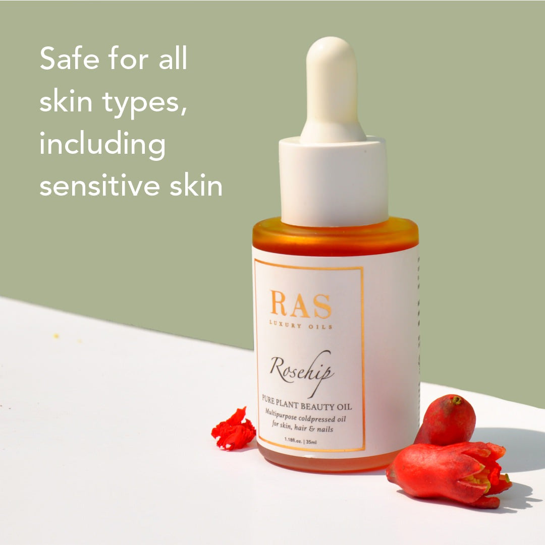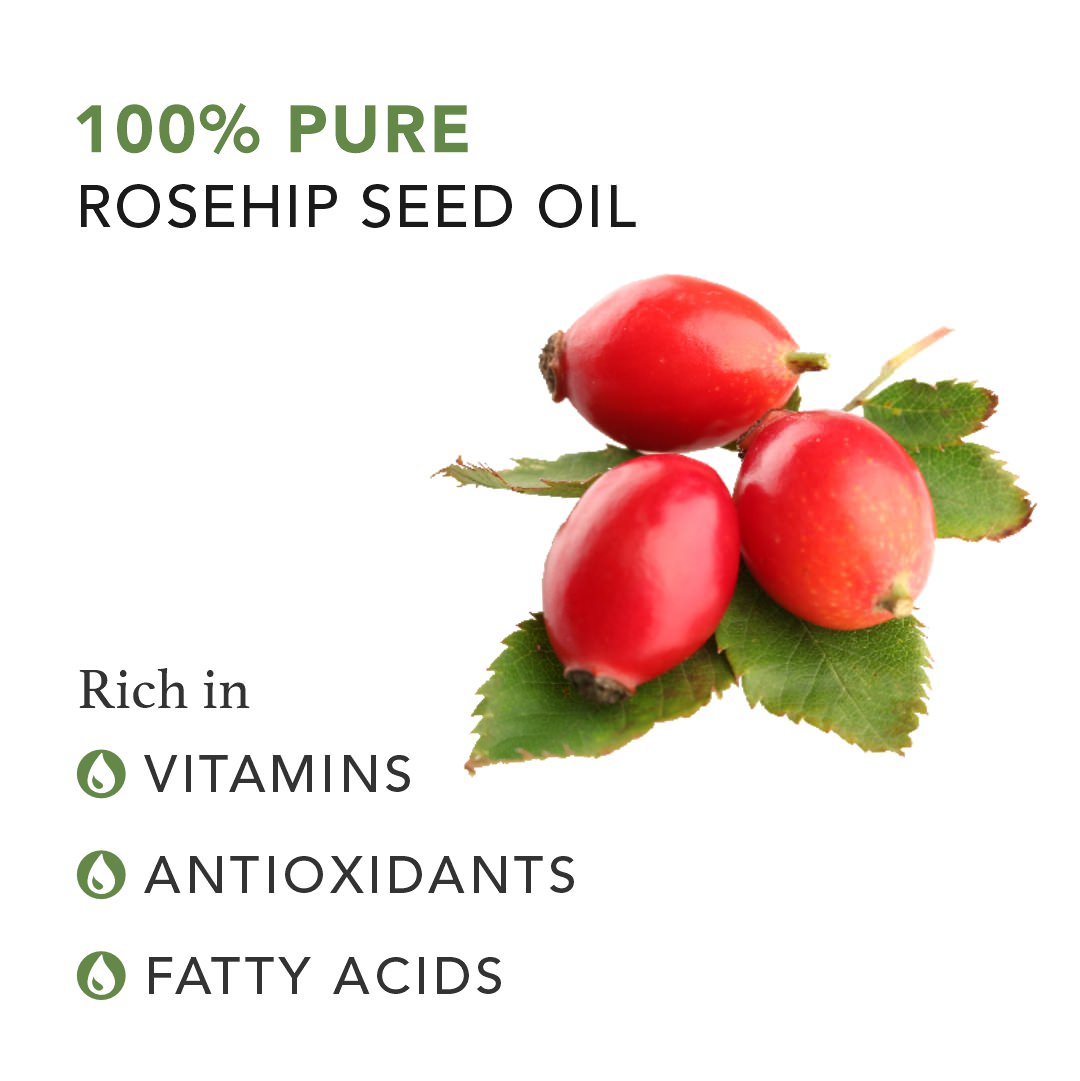 100% Pure Rosehip Seed Oil- A natural ingredient that's rich in Vitamin C, Vitamin A and antioxidants that detox and nourish the skin, while improving skin tone.