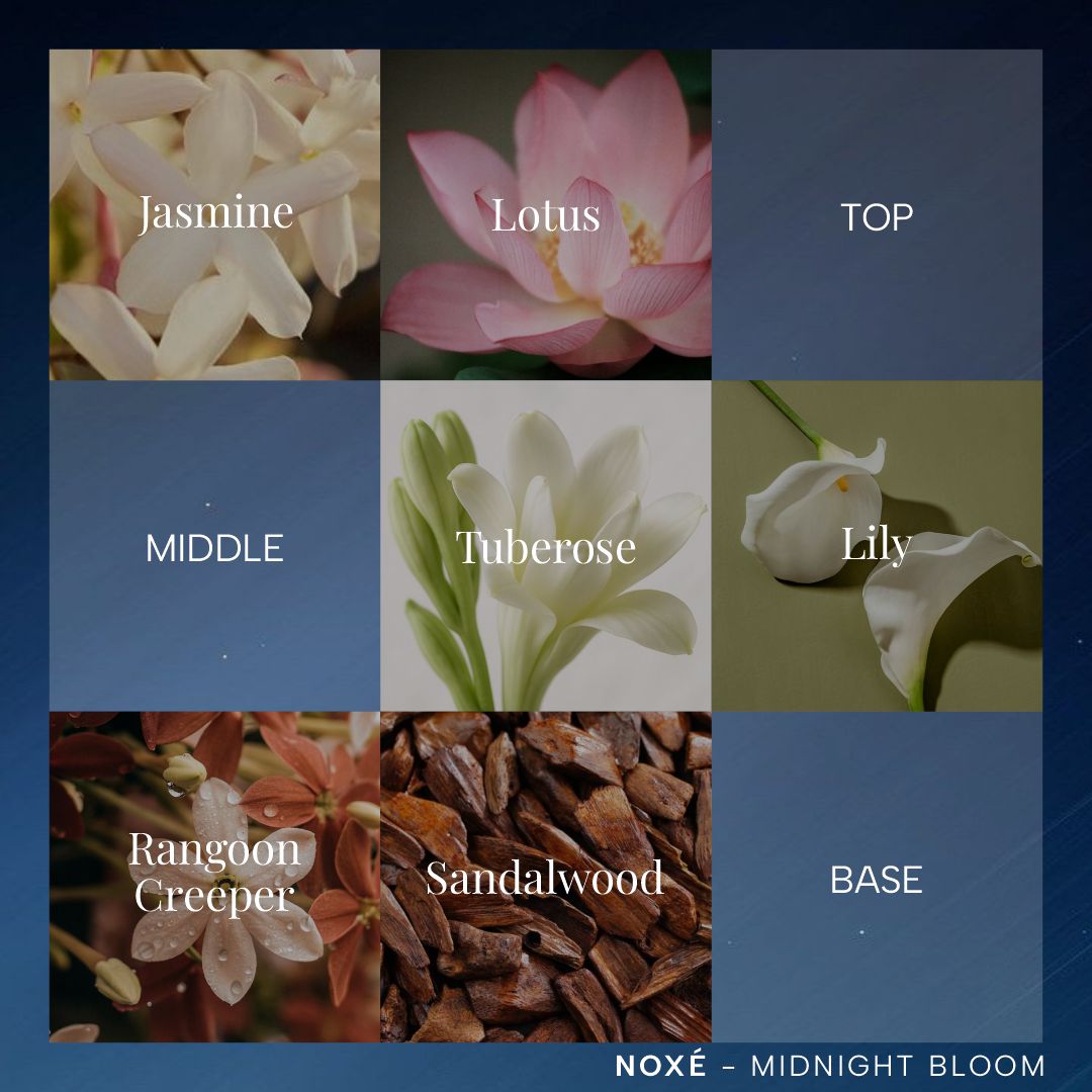 NOXÉ – Midnight Bloom: Jasmine, lotus & tuberose wrapped in sandalwood — soft, mysterious, timeless.