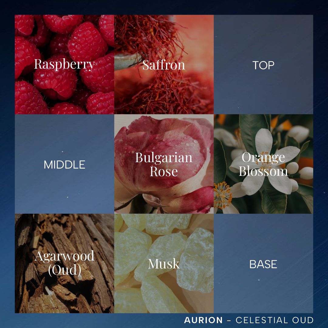 AURION – Celestial Oud: Raspberry, rose & oud with amber — bold, luxurious, magnetic.