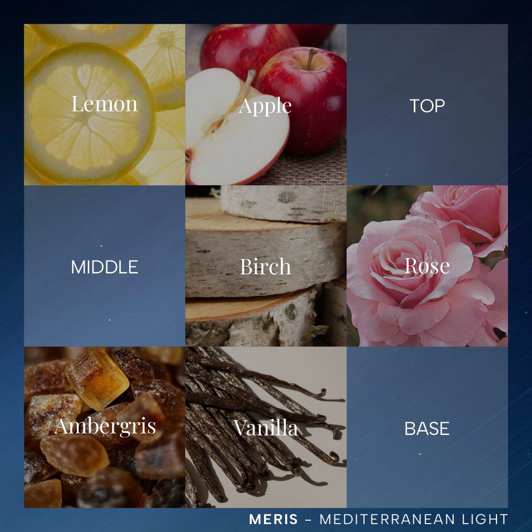 MERIS – Mediterranean Light: Bergamot, citrus & rose — clean, fresh, effortlessly chic.