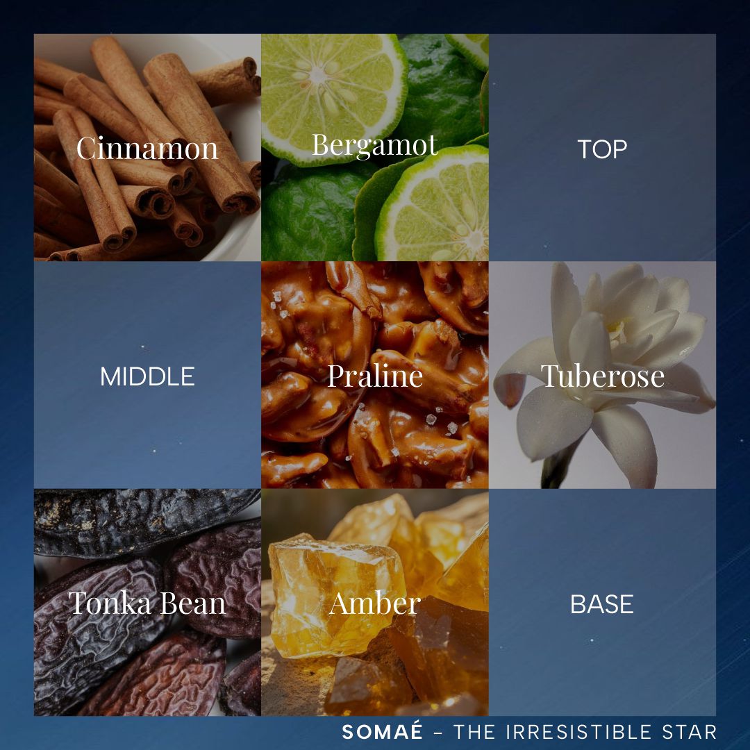 SOMAÉ – The Irresistible Star: Cinnamon, vanilla & praline — warm, comforting, irresistibly sensual.