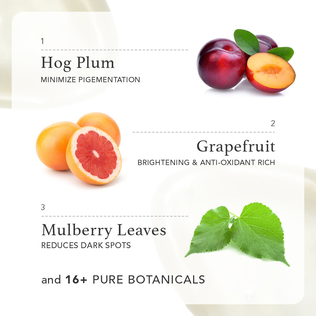 Aqua (Water), Glycyrrhiza Glabra (Licorice) Root Extract, Aloe Barbadensis (Aloevera) Leaf Extract, Citrus Aurantium Dulcis (Orange) Peel Extract, Morus Alba (Mulberry) Leaf Extract, Citrus Limon (Lemon) Peel Extract, Camellia Sinensis (Green Tea) Leaf Extract, Piper Betle Leaf Extract, Spondias Mombin (Hog Plum) Pulp Extract, Isodecyl Neopentanoate, Caprylic Capric Triglyceride, Isopropyl Myristate, Propanediol, Niacinamide, Glycerin, Kojic Dipalmitate, Hippophae Rhamnoides (Sea Buckthorn) Oil, Ceramide NP, Ceramide AP, Ceramide EOP, Phytosphingosine, Glutathione, Sodium Lauroyl Lactylate, Lecithin, Alpha-Arbutin, Linolenic Acid, Linoleic Acid, Tocopheryl Acetate (Vitamin E), Hydrolyzed Hyaluronic Acid, Ascorbyl Palmitate, , C14-22 Alcohols, C12-20 Alkyl Glucoside, Cetearyl Olivate (And) Sorbitan Olivate, Xylitylglucoside (and) Anhydroxylitol (and) Xylitol, Cyclotetrapeptide-24, Aminocyclohexane Carboxylate, Phenoxyethanol (And) Ethylhexylglycerin, Cyamopsis Tetragonoloba (Gaur) Gum, Sodium Gluconate.
